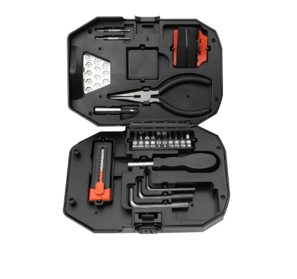 The Built2Work Flashlight 22-Piece Tool Set features an innovative, space-saving design with a flashlight built into the toolbox. It conveniently doubles as a headlamp and features straps that allow it to be carried easily. This 22-piece set is constructed from ABS plastic and comes with a box cutter, an Allen wrench set, a socket set, a pair of pliers, a 1M tape measure, a connector, and a mini screwdriver. Plus, three AAA Batteries are included with your purchase.